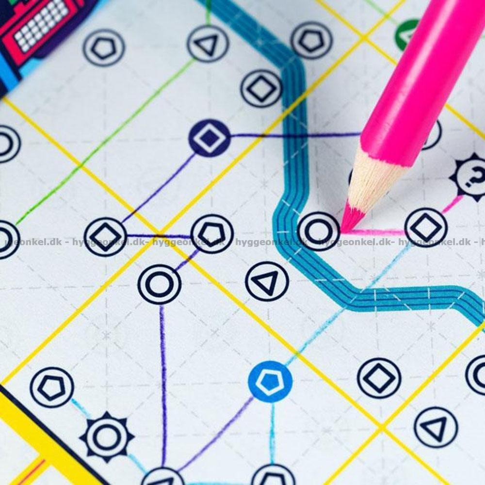 1 spelblock med 100 ark, 4 blyertspennor och 20 kort.