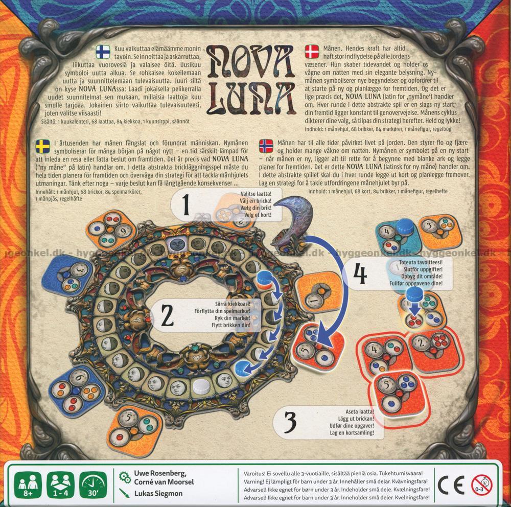 Nova Luna är ett strategispel, i vilket det gäller att göra de rätta valen. Spelet innehåller också en hel del klurigheter, så de små grå cellerna kan få arbeta. Se om du kan få dina marker på plats före dina motspelare genom att utföra olika uppdrag.