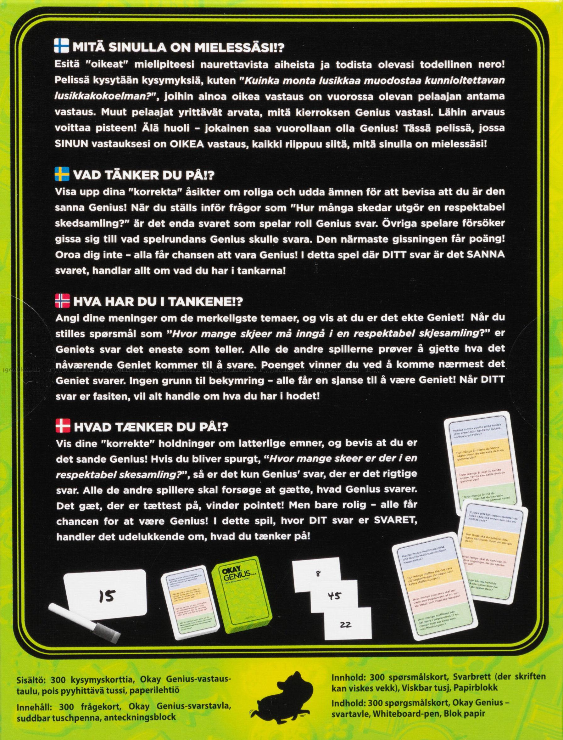 Okej, Genius är ett underhållande sällskapsspel där det handlar om åsikter, magkänsla och udda bedömningar snarare än rätt och fel svar. I varje omgång utses en Genius, och när det ställs frågor om allt från vardagsvanor till absurda ämnen, är det just Geniusens svar som blir sanningen. De övriga spelarna ska försöka gissa vad omgångens Genius skulle svara, och ju närmare man kommer, desto fler poäng får man.