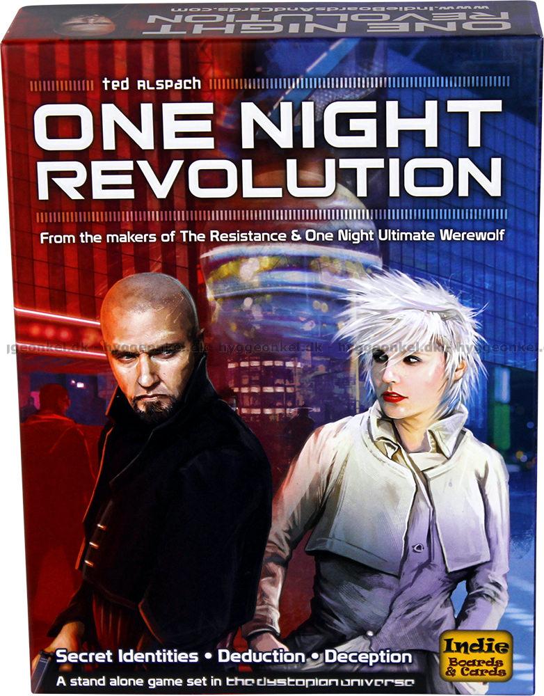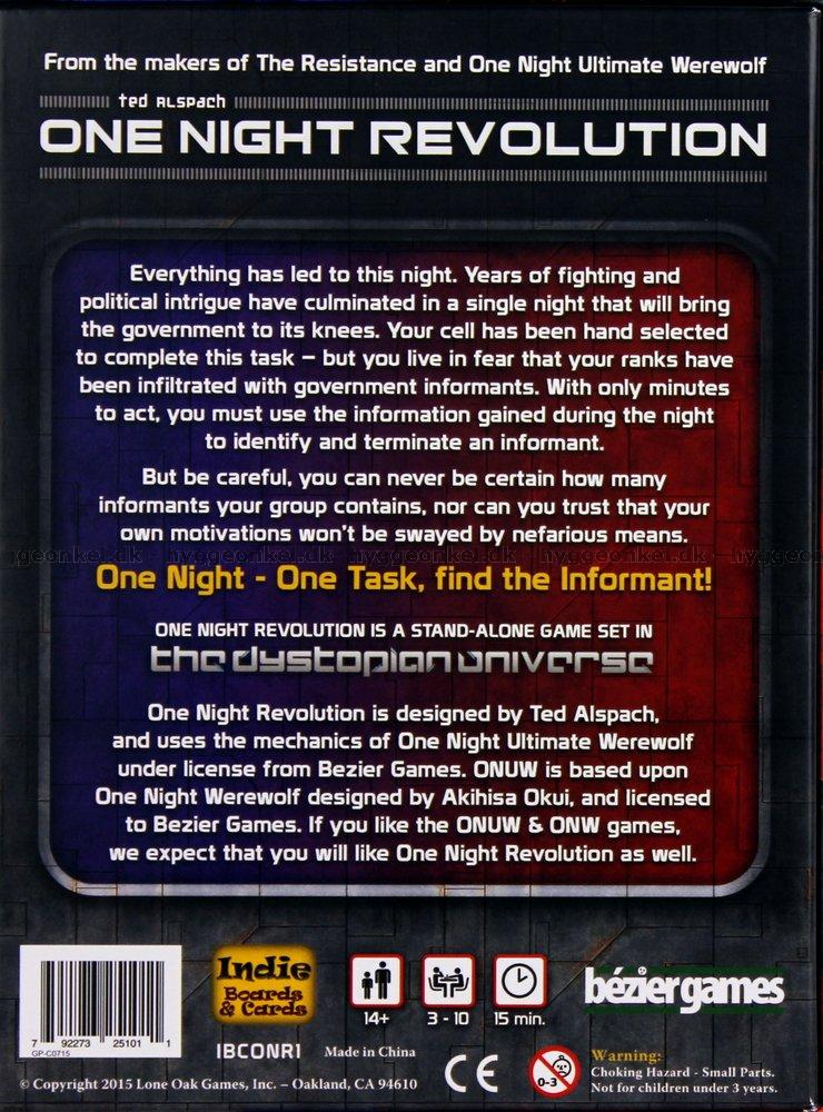 One Night Revolution (tidigare känt som One Night Resistance) är ett snabbt spel om hemliga identiteter för 3-10 spelare. Spelidén kombinerar de deduktiva och kaotiska elementen från "One Night Ultimate Werewolf" med en mer strukturerad spelmekanik. Resultatet är ett smått beroendeframkallande spel som är enkelt att lära sig och som garanterat blir en frekvent gäst vid köksbordet.