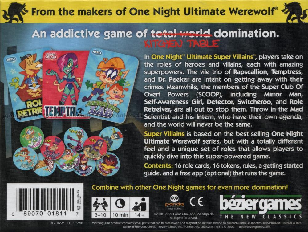 One Night Ultimate Super Villains är ett snabbt spel för 3-10 spelare, i vilket alla tilldelas en rollfigur med superkrafter. Vem är hjälte och vem är skurk?