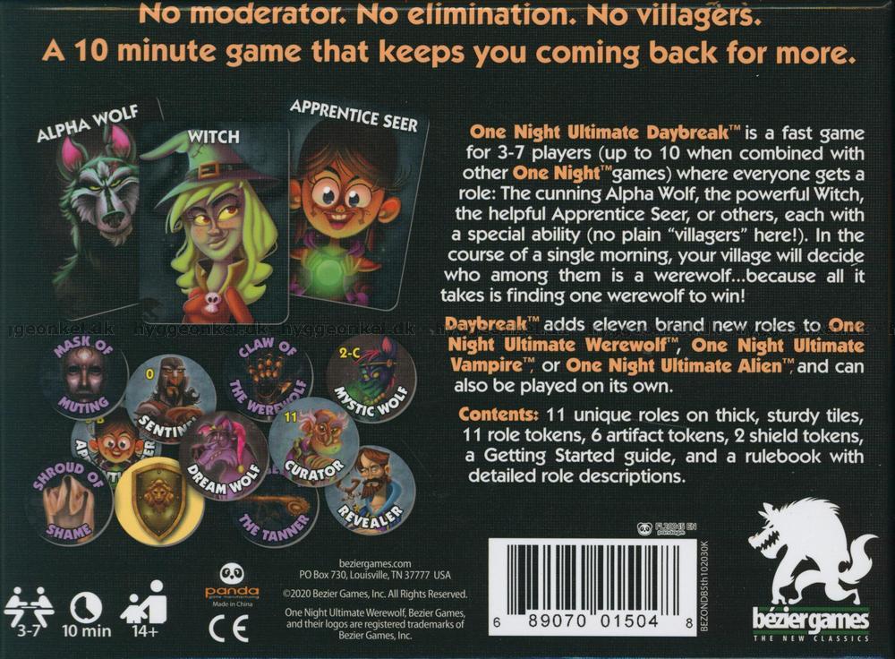 I Daybreak finns 11 helt nya roller som kan användas i spelet. Du behöver inte ha originalet Ultimate One Night Werewolf för att spela, men har du båda kan du blanda rollerna efter egna önskemål och dessutom kan ni vara upp till 10 spelare.