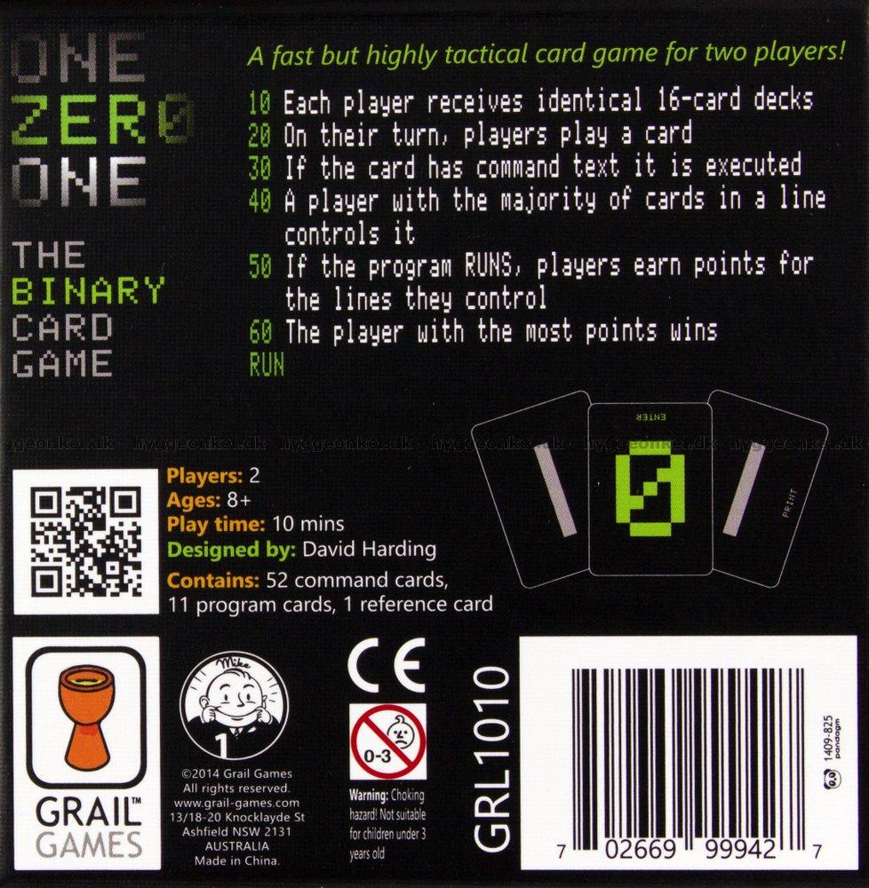 One Zero One is an abstract strategy card game for two players. With identical 16-card decks, each player (as either 0 or 1) plays cards to the program display, endeavouring to gain control of lines of program code. Each line is worth a set number of points. As soon as the program runs, points are tallied and the winner is determined.
