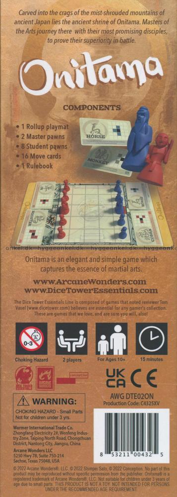 Onitama är ett abstrakt spel för två spelare med komplett information och slumpmässiga startpositioner. På ett 5x5 fält stort bräde får båda spelarna starta med fem pjäser på sin respektive sida varav huvudpjäsen ska placeras på mittenrutan.