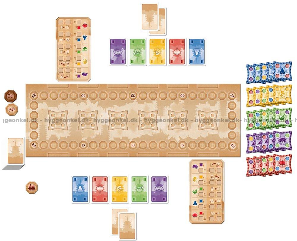Each player has five face up and two face-down colored cards and these cards are used to build pillars for the pagodas.