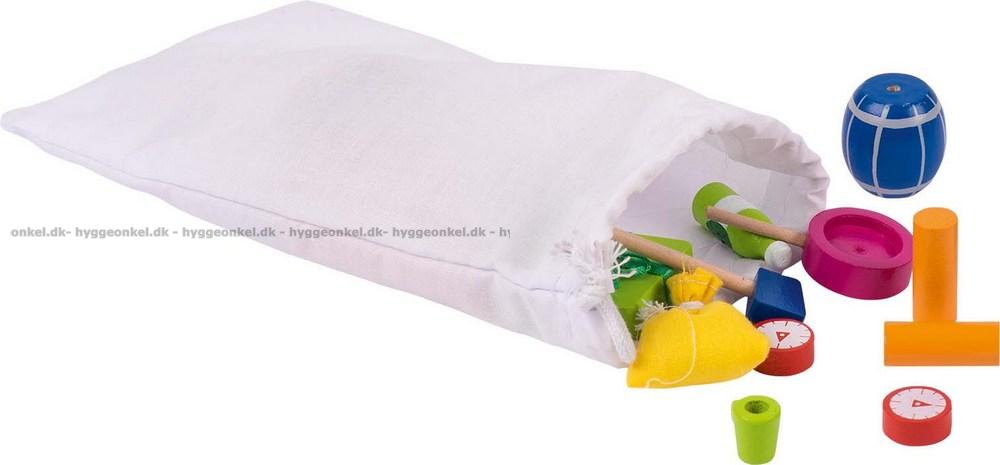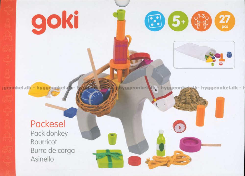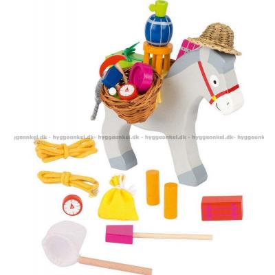 1 åsna i trä (14 x 13 x 2 cm), 2 korgar och en mängd föremål att stapla på åsnan.