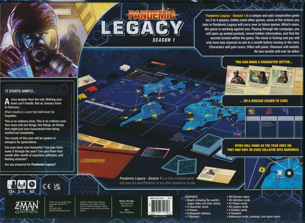 Pandemic som du känner det – bara helt annorlunda. I denna utgåva av Pandemic ska du, som alltid, utrota världens sjukdomar. Det nya är bara att detta är ett "Legacy"-spel, vilket innebär att de val du gör i en omgång kommer att påverka skeendet i nästa omgång. I takt med att du kommer igenom spelet förstörs komponenter och spelet kan därför bara spelas en gång.