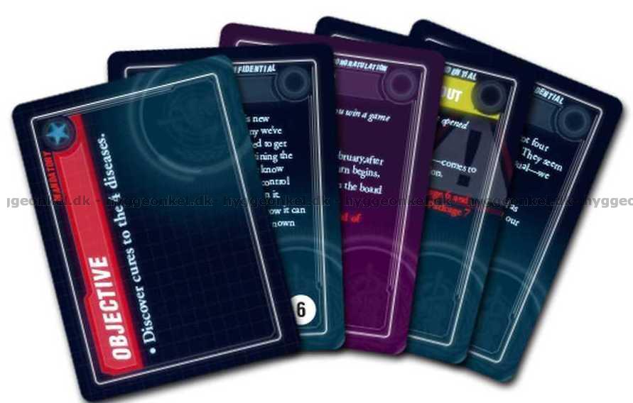 1 spelbräde - 5 karaktärskort - kort och brickor för att utrota sjukdomarna.