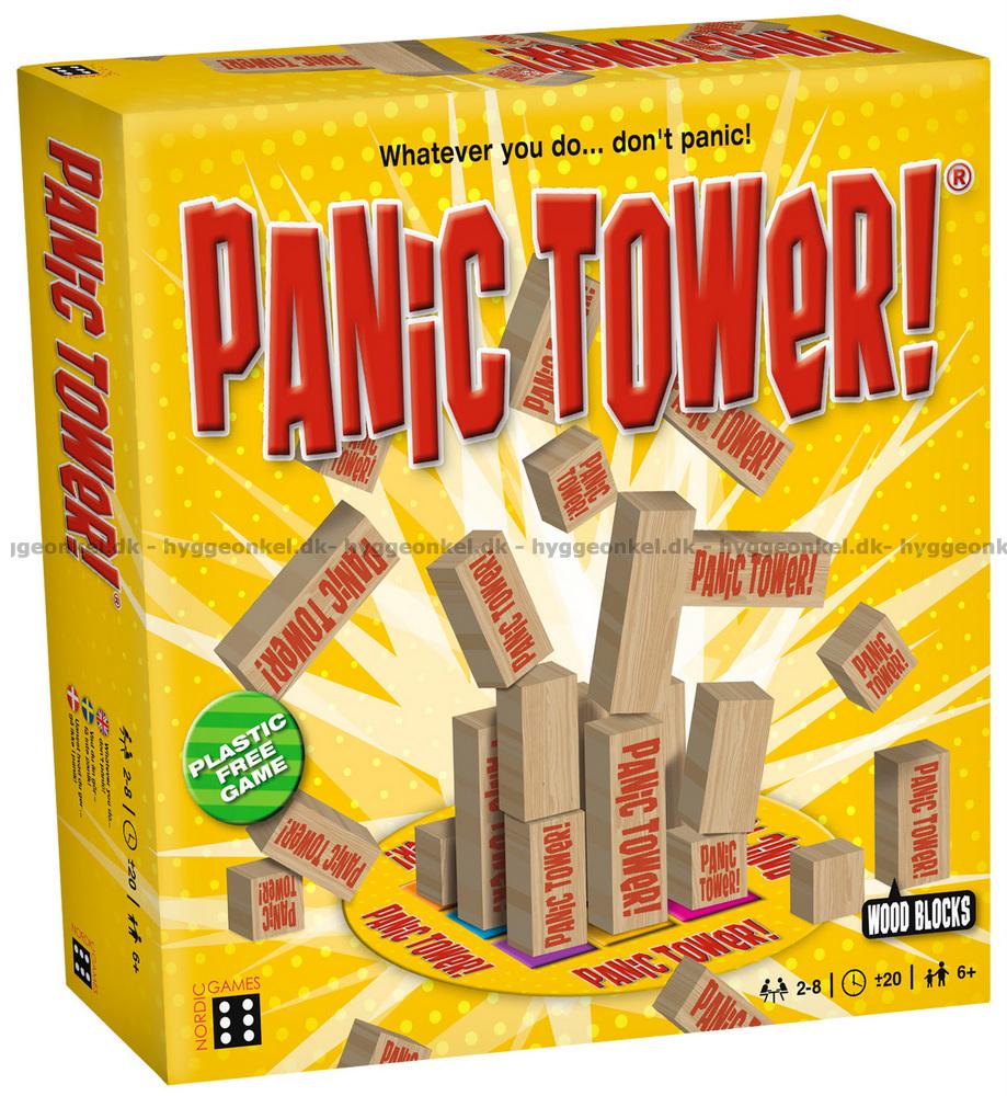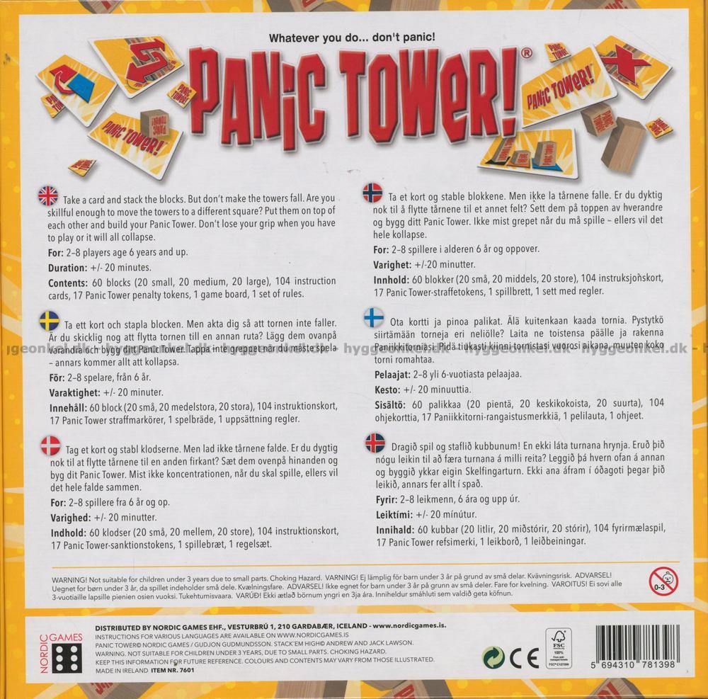 I Panic Tower! gäller det att följa instruktionerna på korten och bygga upp tornen på spelbrädet utan att de faller samman.