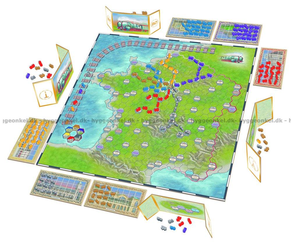 I kartongen hittar du ett stort spelbräde, spelregler på svenska (endast två sidor!), 6 skärmar, en påse med nästan 200 små trälokomotiv, 1 tygpåse samt 6 lokomotivplattor.