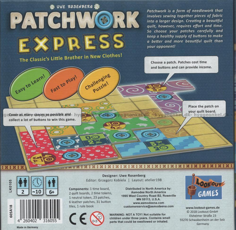 Ibland gäller det att vara lite flinkare med handarbetet, så i denna version av Patchwork är spelplattorna lite mindre. I gengäld är "tygbitarna" lite större.