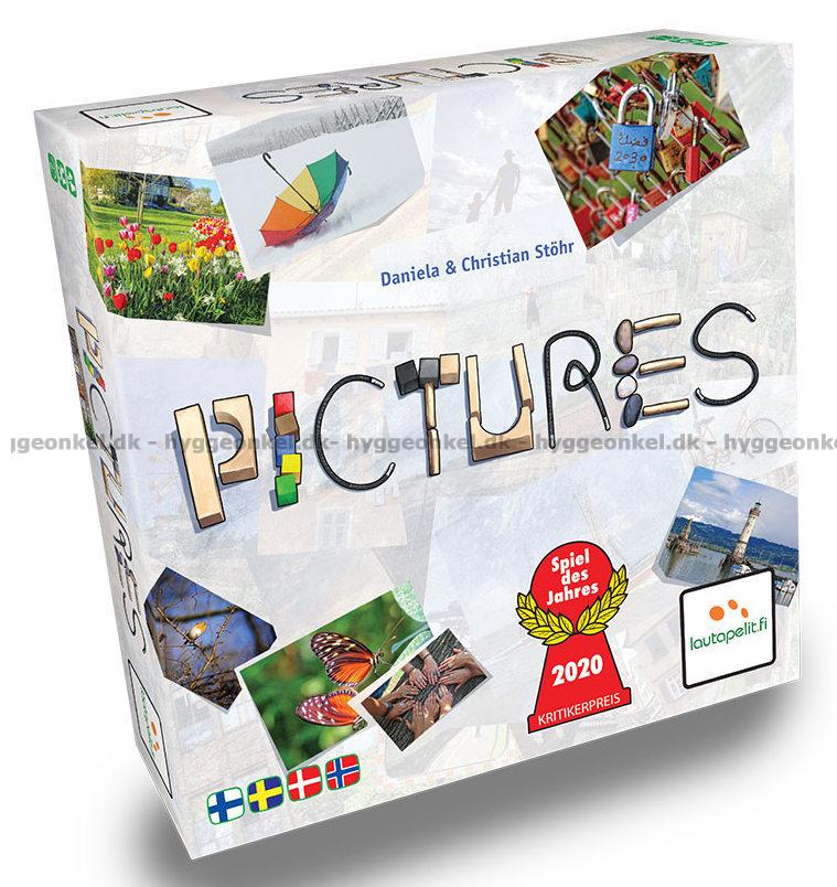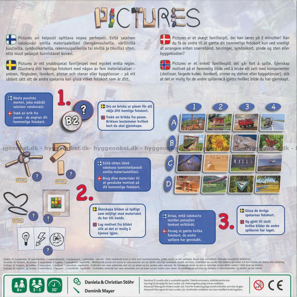 I Pictures hittar du totalt 91 stycken dubbelsidiga fotokort. 16 av dessa kort placeras på bordet och ska förbli där under hela spelomgången.