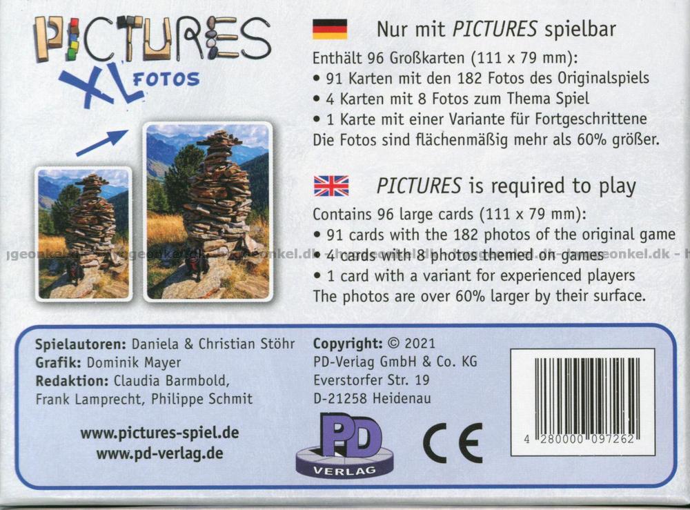 I Pictures hittar du allt som allt 91 dubbelsidiga fotokort. 16 av dessa kort placeras på bordet och ska förbli liggande under hela spelet.
