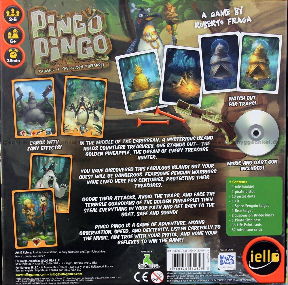I kartongen för Pingo Pingo finns en pistol med gummipilar, CD med musik, kort och spelregler (på engelska).