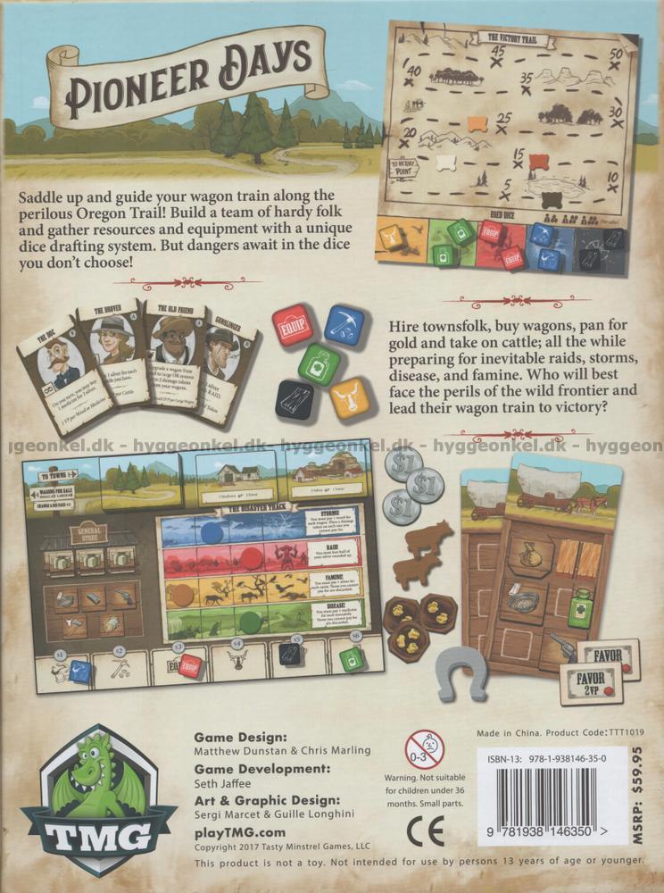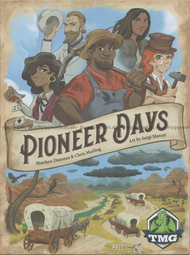 Pioneer Days är ett dice drafting-spel om det historiska Oregon Trail. Medan du följer din valda strategi ska du vara förberedd på nära förestående katastrofer som stormar, sjukdomar, överfall och svält.