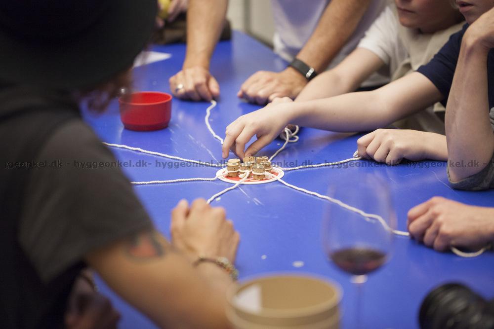 Alla spelare börjar med att placera sina "proppar" (cylinderformad box) på mitten av bordet. På varje prop finns ett snöre.