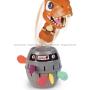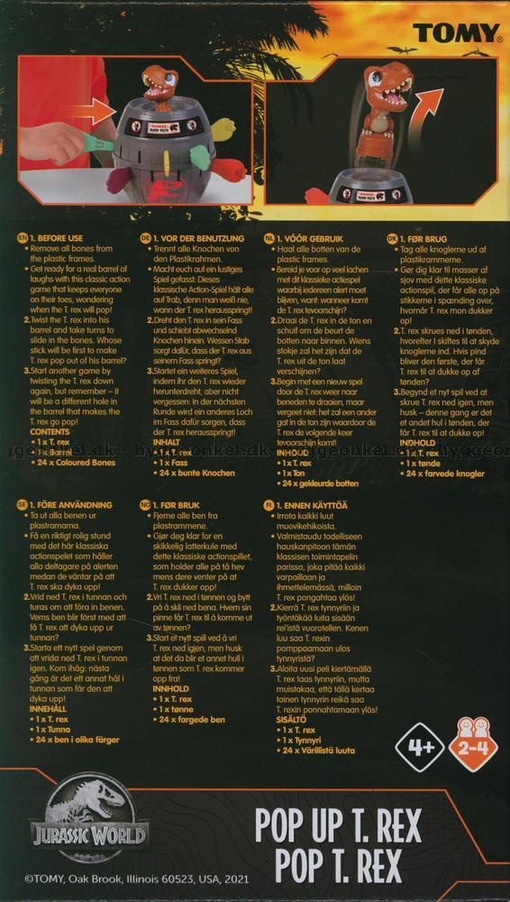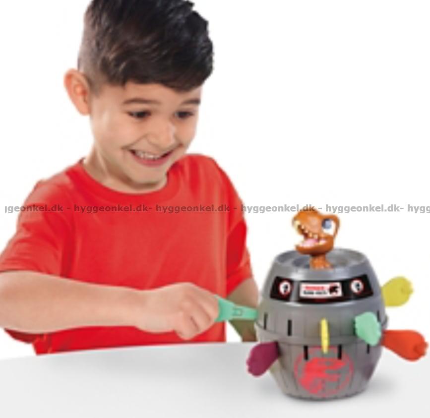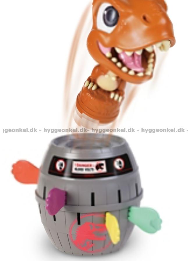 Vrid ned dinosaurien i tunnan och turas om att stoppa in benen i hålen. Vem blir den första att få dinosaurien att hoppa upp?