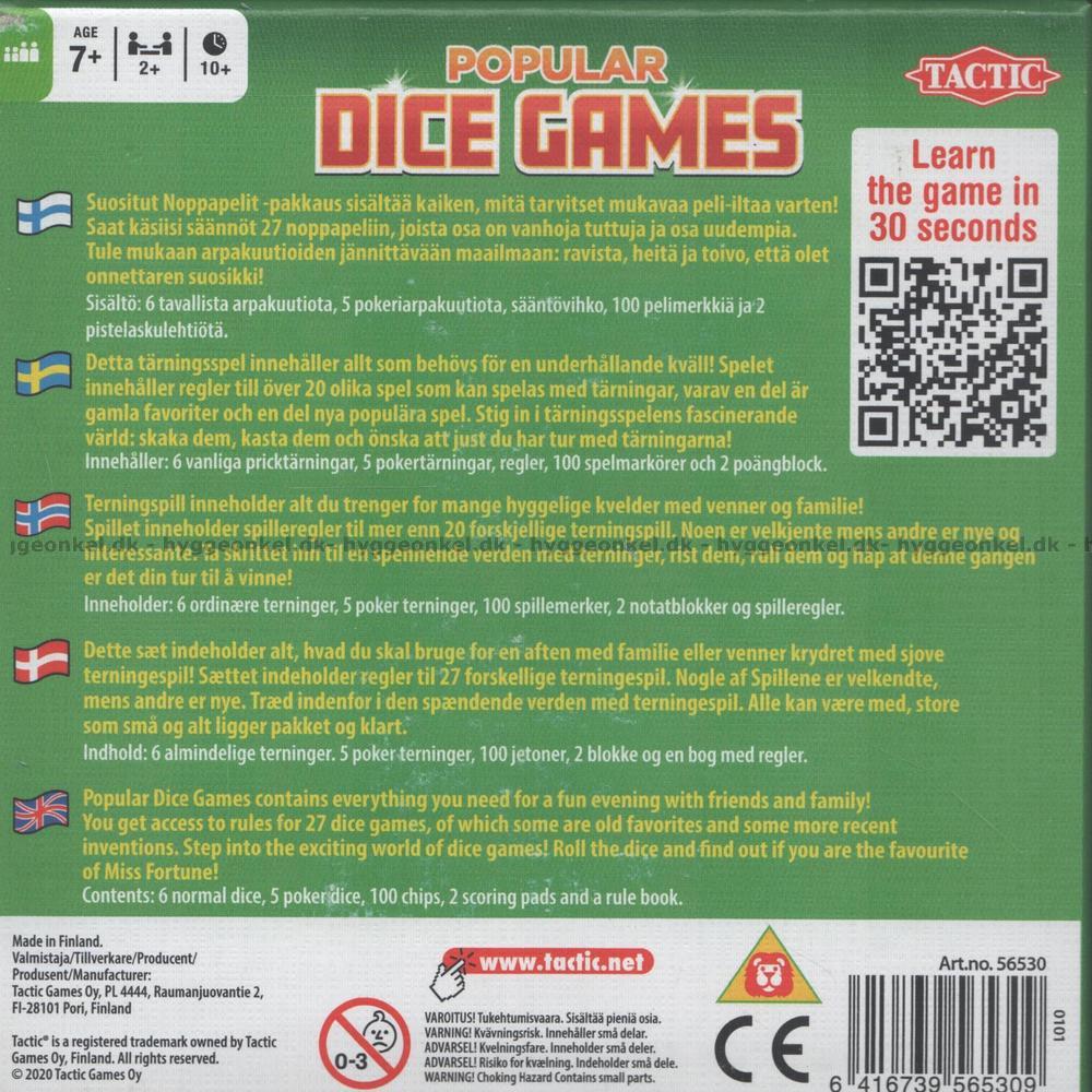 Det följer med spelregler på svenska till en rad roliga tärningsspel. I regelhäftet finns regler till fem av spelen. Dessutom finns en länk till var man kan hitta övriga regler.