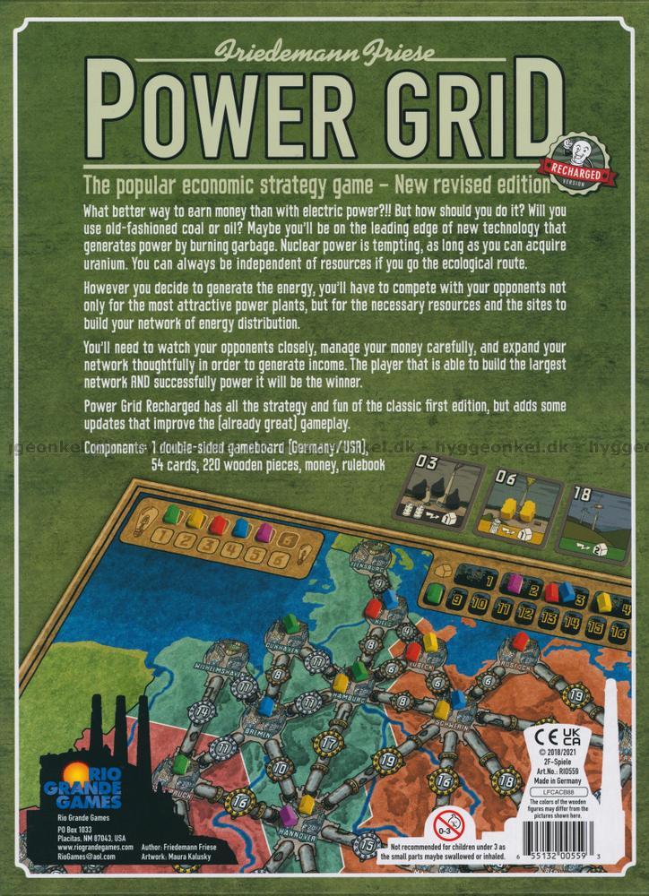 I Power Grid ska man förse flest städer med ström. Spelarna markerar förbindelser i elnätet och kämpar om att köpa de kraftverk som kan leverera strömmen. När olika kraftverk köps blir dock nya, mer moderna, kraftverk tillgängliga. Bara genom att köpa för att kunna leverera ström ger man alltså de andra spelarna tillgång till överlägsen teknik.