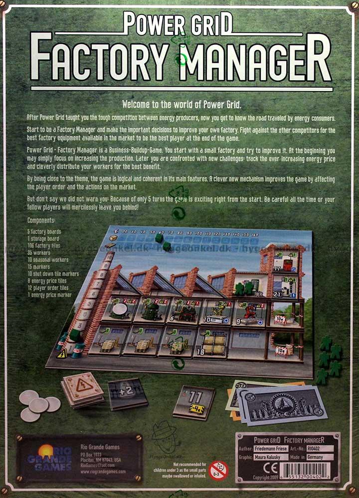 I asken hittar du 5 fabriksbräden, 1 förvaringsask, 106 fabriksbrickor, 45 arbetare och en mängd marker och brickor.