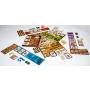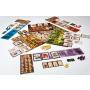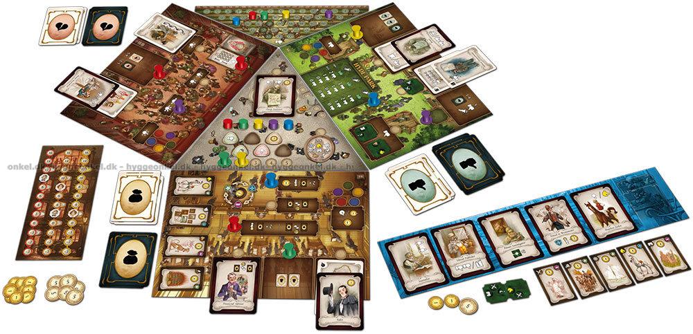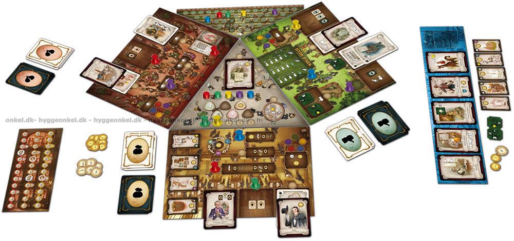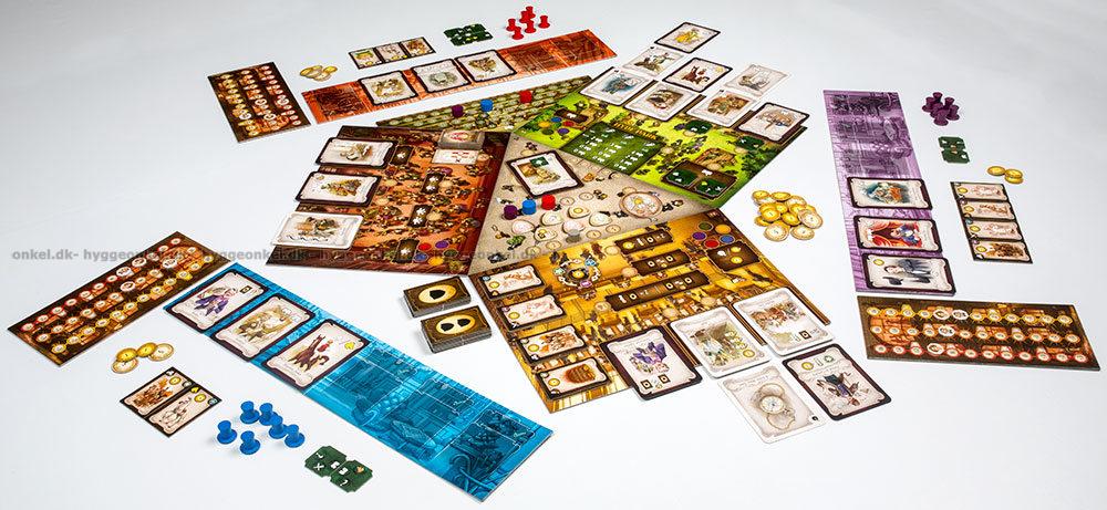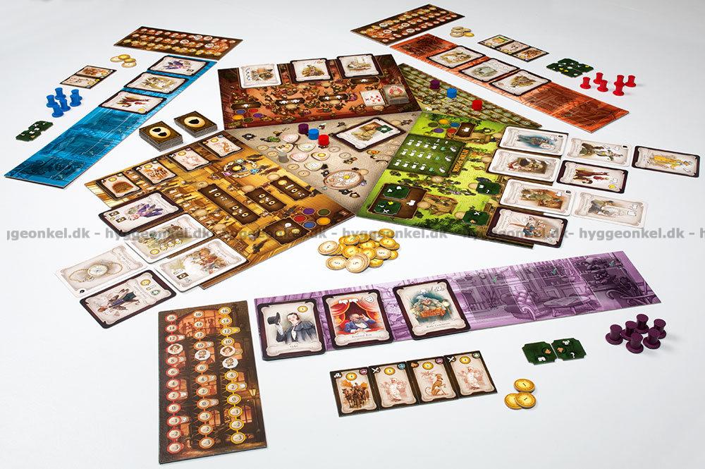 2 dubbelsidiga spelbräden, trämarker, kort och en mängd brickor i kartong.
