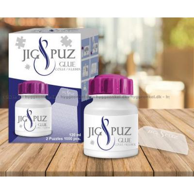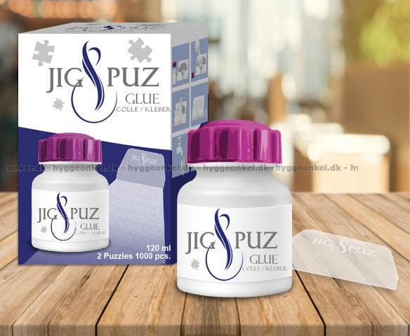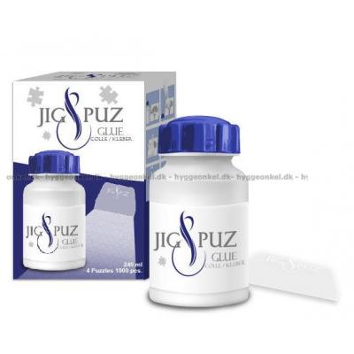 Förutom burken med lim medföljer också en praktisk spatel för enklare applicering av limmet på pusslet.