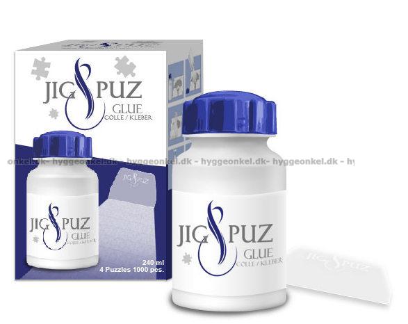 Förutom burken med lim medföljer också en praktisk spatel för enklare applicering av limmet på pusslet.