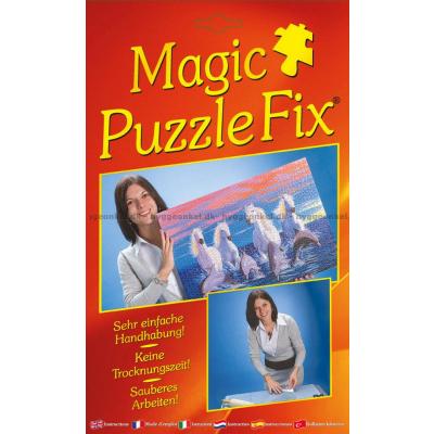 Skydda bordet med papper eller plast (medföljer inte), lägg pusslet ovanpå och applicera rikligt med lim (i locket finns en svamp för enkel applicering).