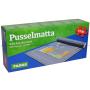 På mattan finns markeringar som du kan använda som mallar för hur stor plats ett genomsnittligt pusselspel tar. Du ska dock vara uppmärksam på att inte alla pussel passar innanför markeringarna.