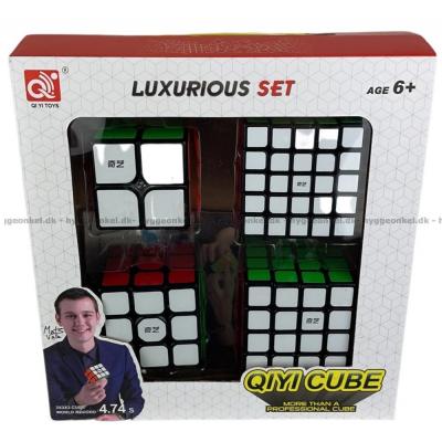 Här får du 4 Qiyi-kuber: 2 x 2 - 3 x 3 - 4 x 4 - 5 x 5 fält (fälten består av klistermärken).