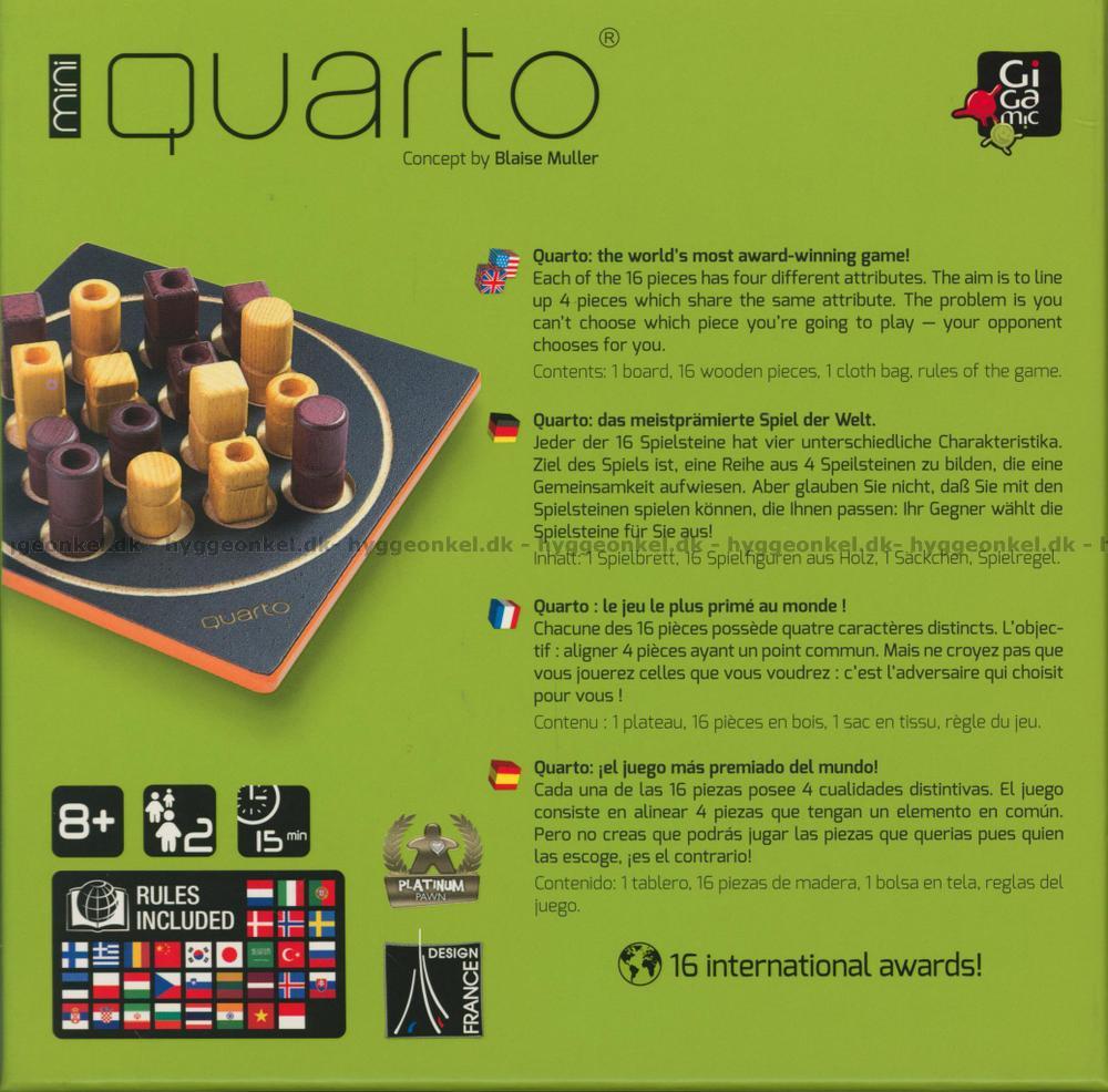 Quarto är ett strategiskt spel för 2 personer. I all sin enkelhet går spelet ut på att skapa "4 i rad". Det låter ju mycket simpelt, men det är det verkligen inte!