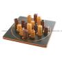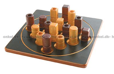 I boxen finner du ett spelbräde i trä som mäter 17 x 17 x 1 cm och 1 påse med 16 träklossar.