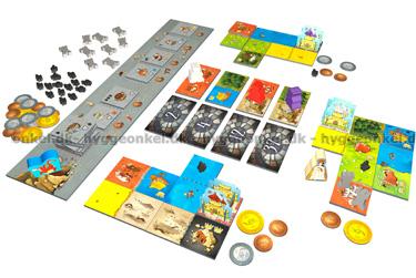 4 startbrickor, 4 slott, 48 dominokort, 8 kungar och en lång rad marker.