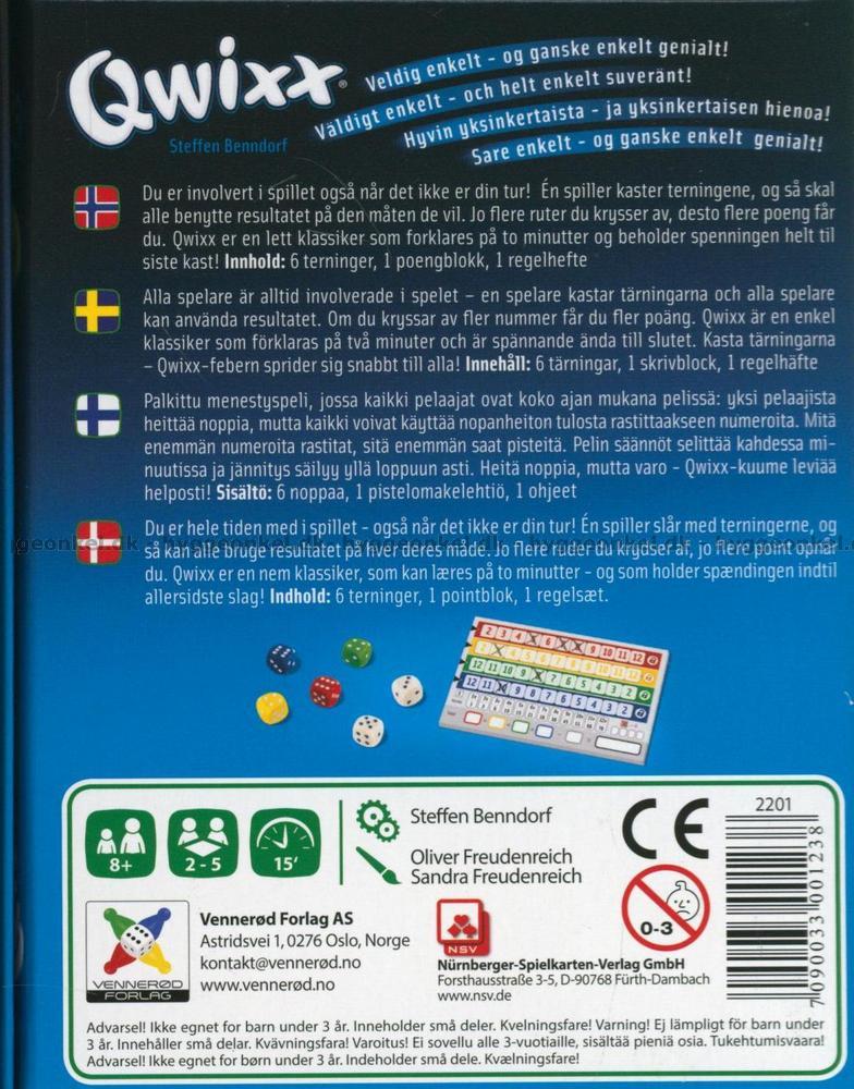 Qwixx lär man sig på 2 minuter, så man behöver inte lägga mycket tid på att lära sig krångliga regler utan kan snabbt komma igång att spela.
