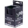 Här får du en tärningsbägare i svart konstläder. Höjden är ca 10 cm. Bägaren har en diameter på ca 8,5 cm.