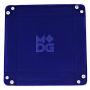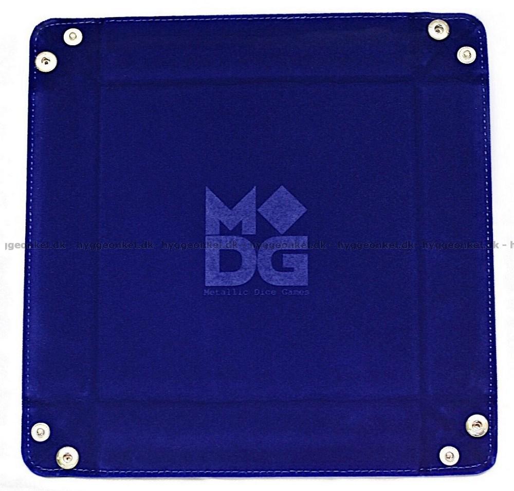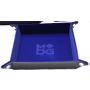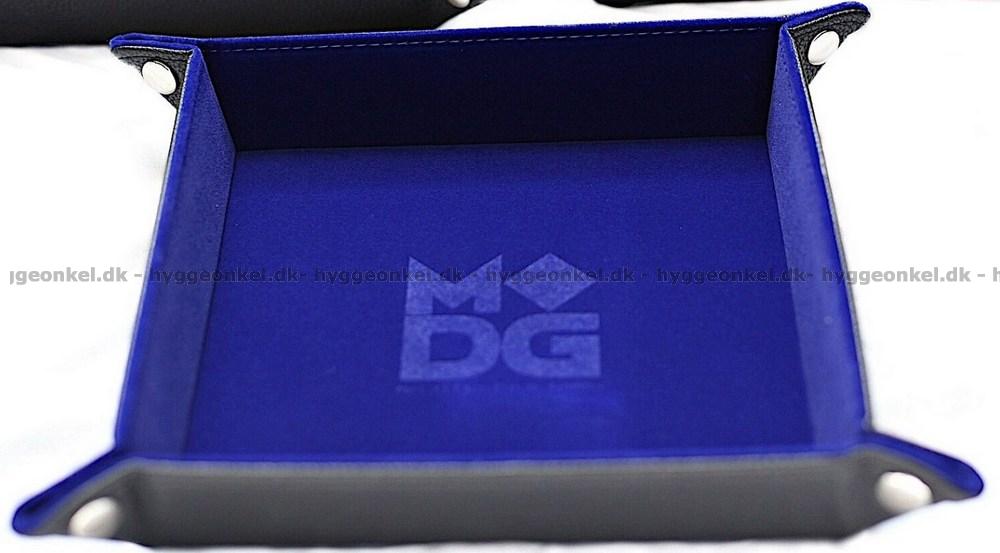 Denna tärningsbricka är klädd med blå filt. Undertill är den i konstläder.