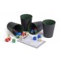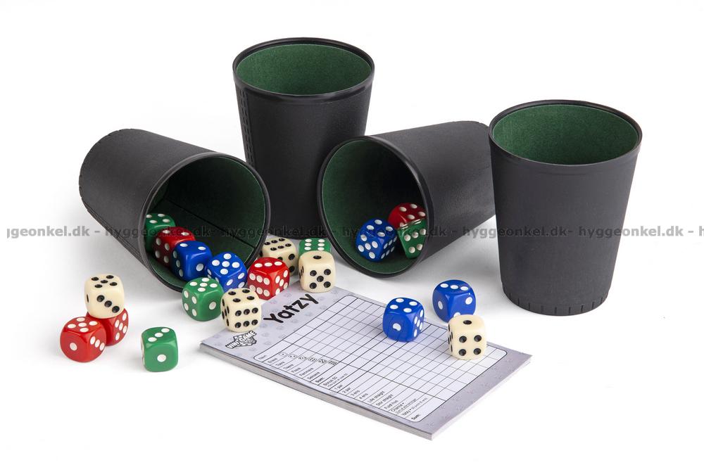 20 tärningar, 4 tärningsbägare, yatzy-block.