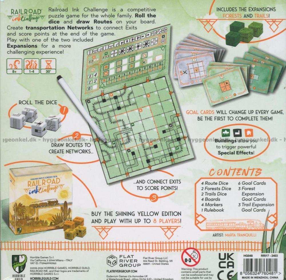 I Railroad Ink är spelarnas mål att koppla ihop så många utgångar på sin spelbräda som möjligt. Varje runda slås en uppsättning tärningar mitt på bordet, och tärningarna avgör vilka typer av vägar och järnvägar spelarna kan bygga. Ni ska rita rutterna på era spelplattor (som kan torkas rena efter användning) och därigenom skapa transportlinjer som är bättre än motståndarnas.