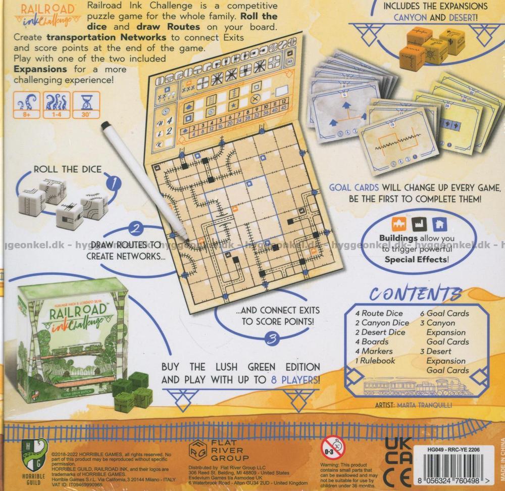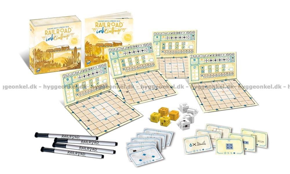 I Railroad Ink är spelarnas mål att koppla ihop så många utgångar på sina spelbräden som möjligt. Varje runda slås en uppsättning tärningar mitt på bordet, och tärningarna avgör vilka typer av vägar och järnvägar spelarna kan bygga. Ni ska rita rutterna på era spelplattor (som kan torkas rena efter användning) och därigenom skapa transportlinjer som är bättre än dina motståndares.