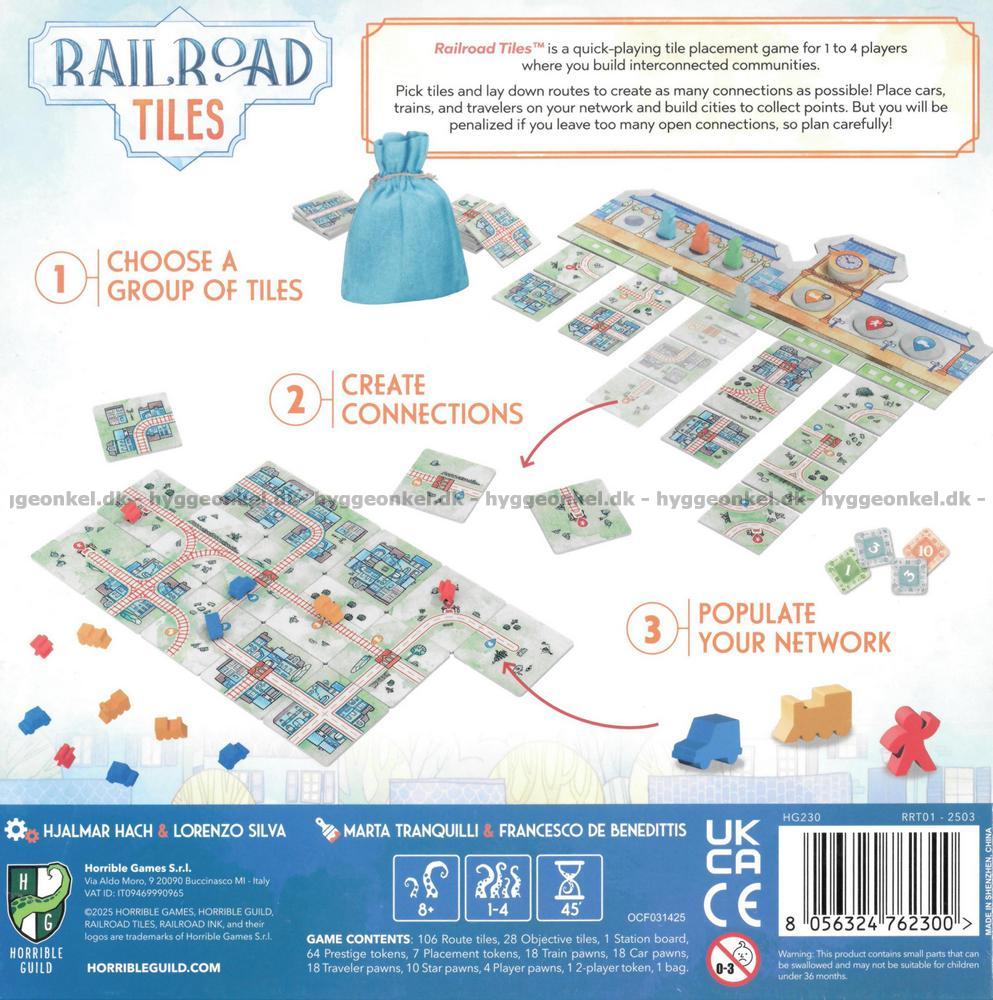 I Railroad Tiles bygger du ditt eget nätverk av järnvägar och motorvägar för att skapa den mest effektiva infrastrukturen. Spelet pågår över åtta rundor, där varje spelare turas om att välja och placera brickor för att utvidga sitt transportnätverk. Du måste koppla samman tågräls och vägar på rätt sätt för att skapa sammanhängande rutter, samtidigt som du planerar stadsområden som ger poäng i slutet av spelet. Under spelets gång placerar du bilar, tåg och resenärer på dina rutter för att samla prestige och öka värdet av ditt nätverk.