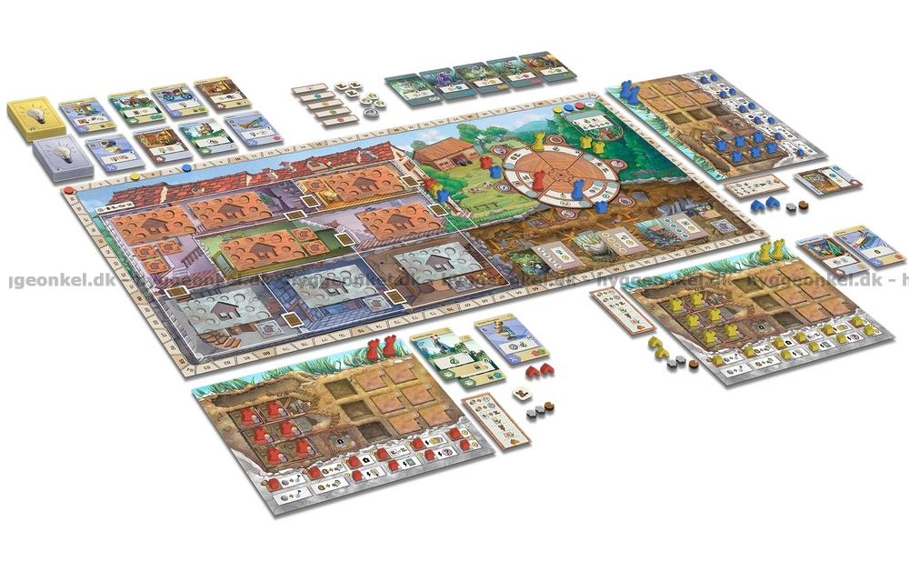 Spelplaner, kort, träbrickor och pappmarkörer.
