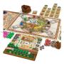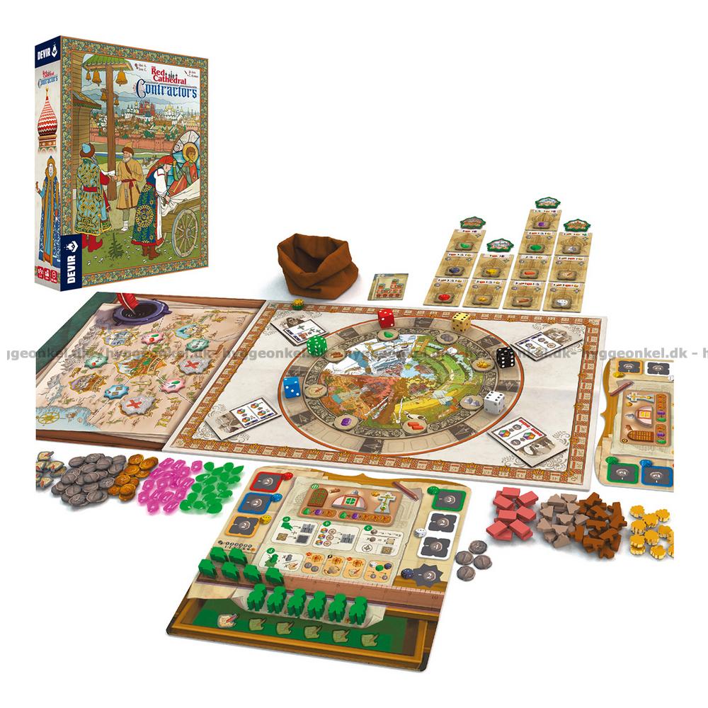 Spelbräden, kort, tärningar, markörer och träpjäser.