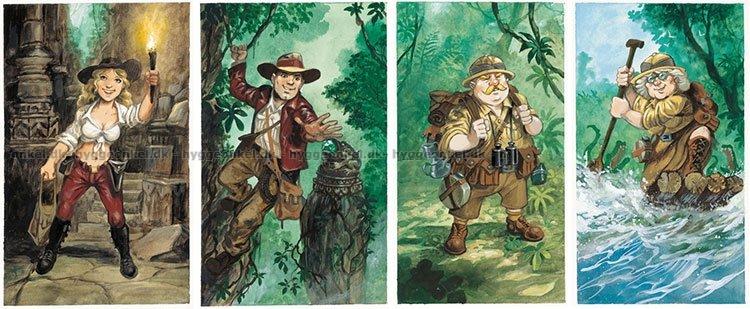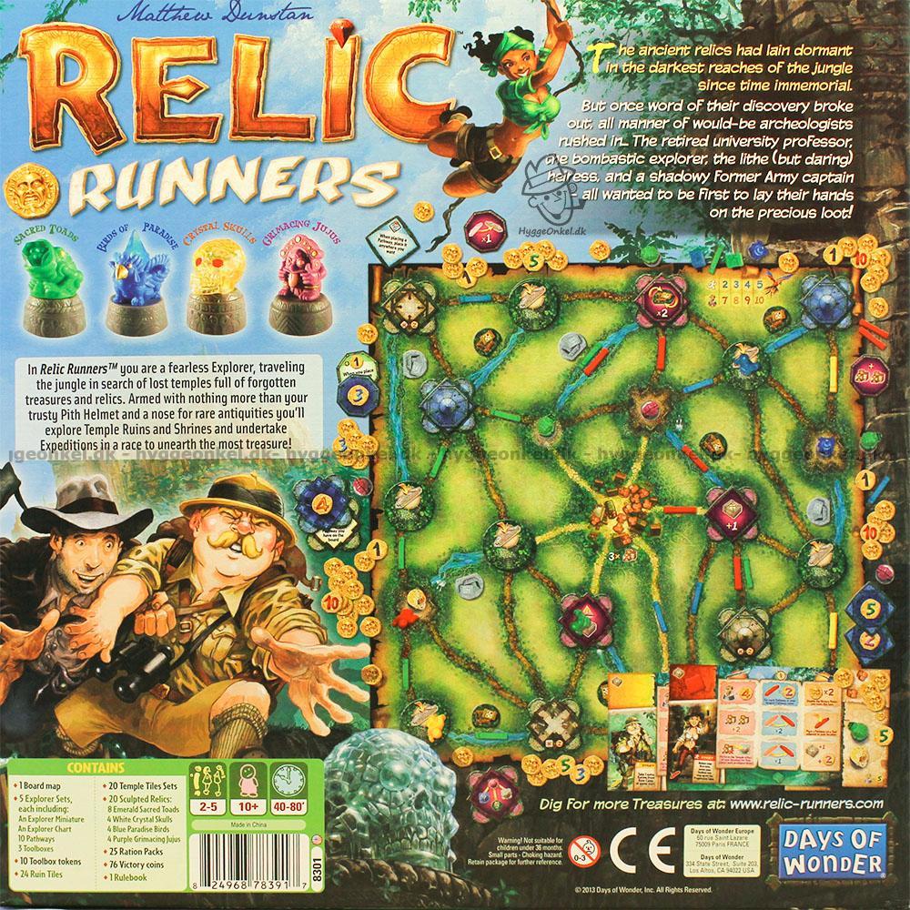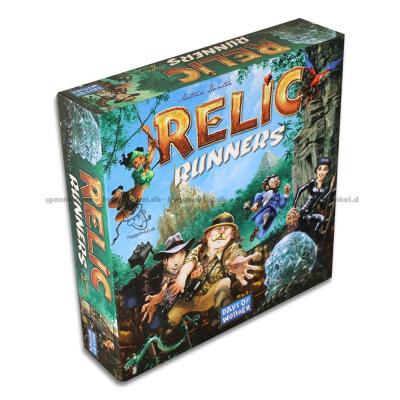 In Relic Runners, each player takes on the role of a character keen to exploit and acquire relics that have been unearthed in a long lost part of the jungle. Each would-be archaeologist has a colorful past — retired university professor, former army captain, etc. — and wants to be the first to get their hands on the precious loot to earn the most victory points.