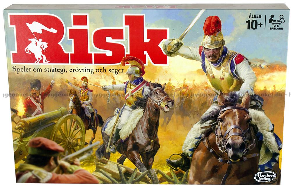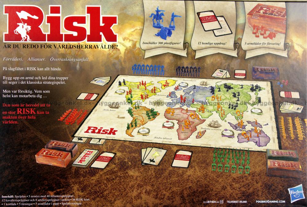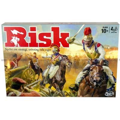 Spelplan, 5 arméer med 40 infanteripjäser, 12 kavalleripjäser, 8 artilleripjäser vardera, 56 RISK-kort, 1 kortlåda, 5 tärningar, 5 armélådor i papp.