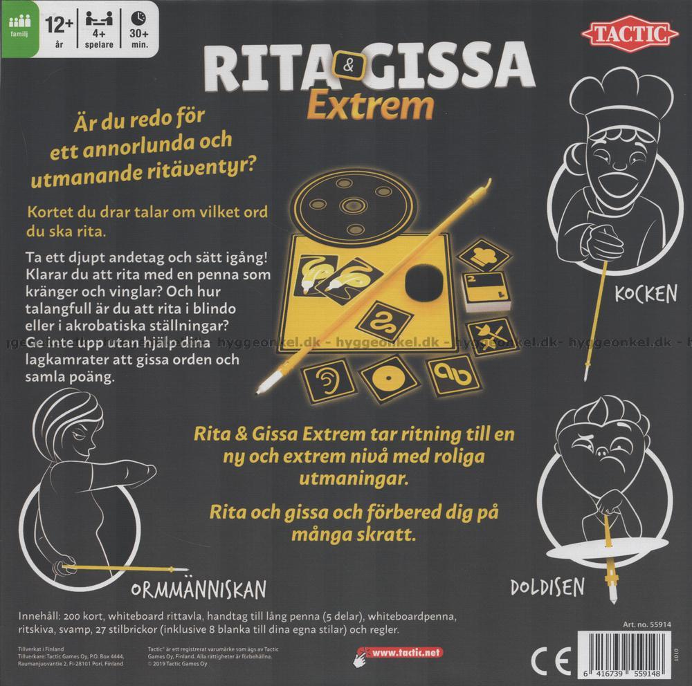 Rita & Gissa Extrem tar grunderna i klassikern Rita & Gissa och skruvar upp svårighetsgraden rejält. Här får alla som är med en ordentlig utmaning. Både den som ska rita och den/de som ska gissa får något att bita i!