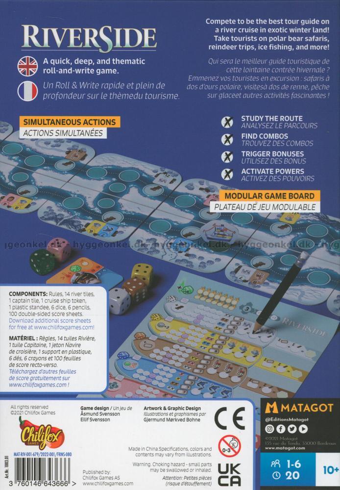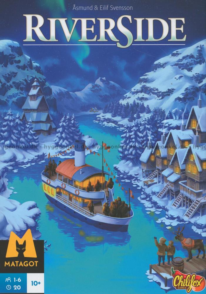 Riverside är ett roll and write-spel som har ett modulärt spelbräde som sätts ihop efter spelets rutt.
