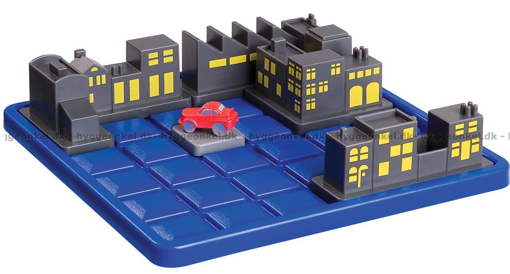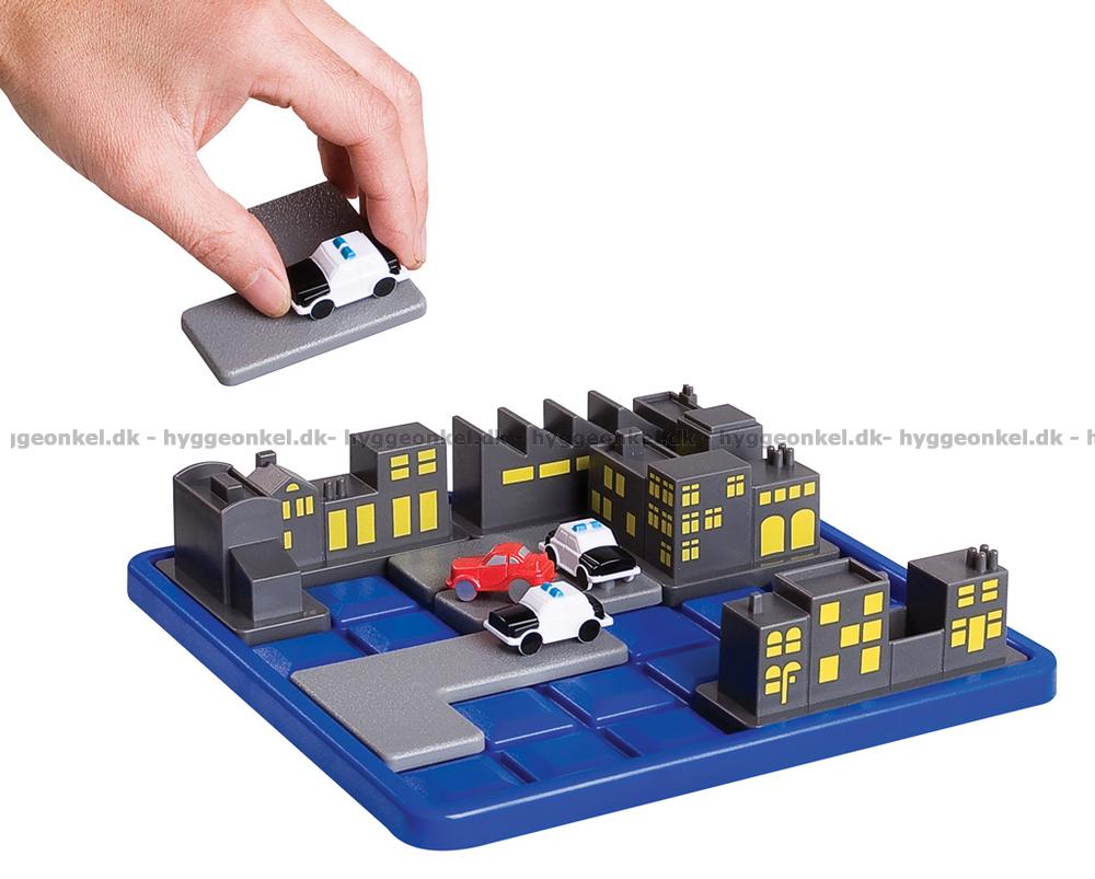 Du väljer en utmaning och placerar ut bitarna på spelbrädet enligt bilden. Sedan är det din uppgift att placera de 6 polisbilarna så att den stulna röda bilen inte kan flyttas åt något håll.