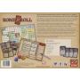 Dubbelsidigt spelbräde, karaktärsark, kort, pjäser i trä, tärningar och penna.