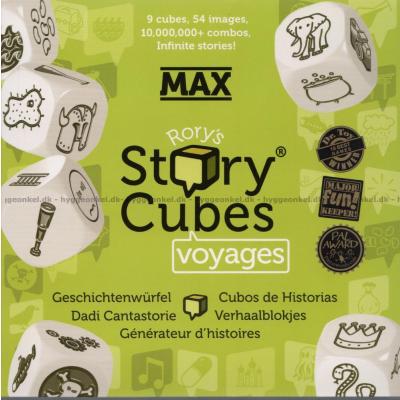 9 berättartärningar samt ett häfte med spelregler på engelska är vad du får med i asken.