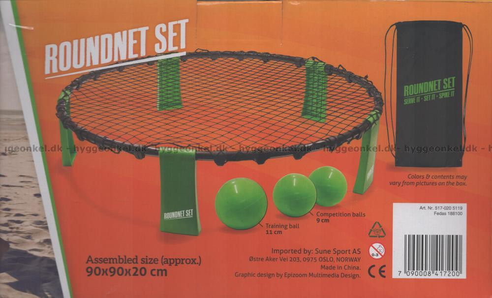 1 nät (mäter 90 x 90 x 20 cm - ska monteras innan användning), 1 stor boll (i plast - diameter 11 cm), 2 små bollar (i plast - diameter 9 cm) och förvaringsväska.